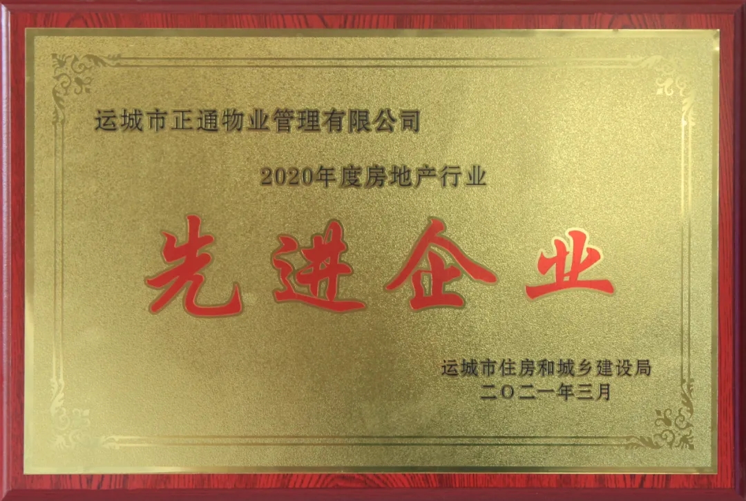 ▲運(yùn)城市正通物業(yè)管理有限公司榮獲“2020年度房地產(chǎn)行業(yè)先進(jìn)企業(yè)”