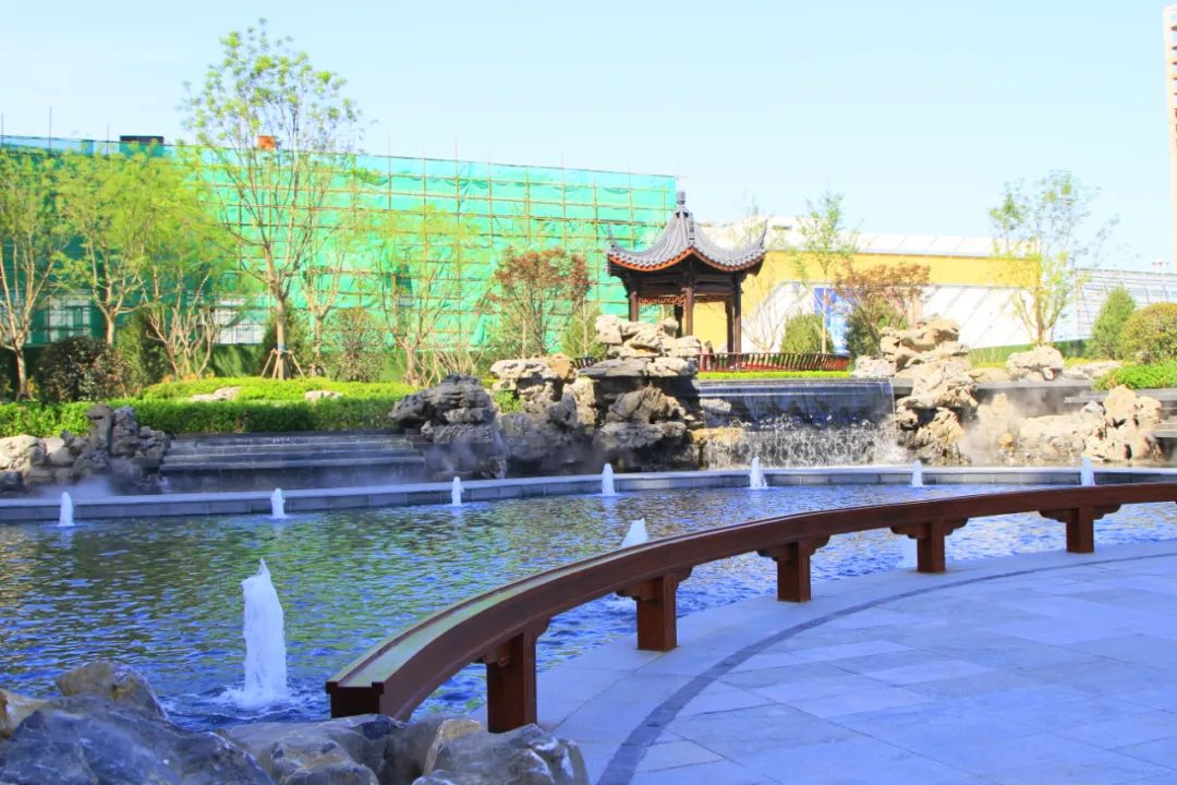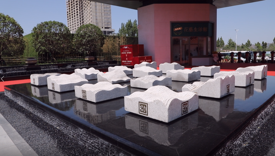 坐落在歷史景觀長軸與和軸的十字交叉點,水景以黑金砂鋪設(shè),呈現(xiàn)出“和”字樣式,池底為景泰藍石材,與周邊不銹鋼流水缽、漢白玉玉璽、造型迎客松等連成一體;從高空俯瞰看,它像是印章一樣印在我們國賓府的中心,寓意國賓府業(yè)主家和萬事興。