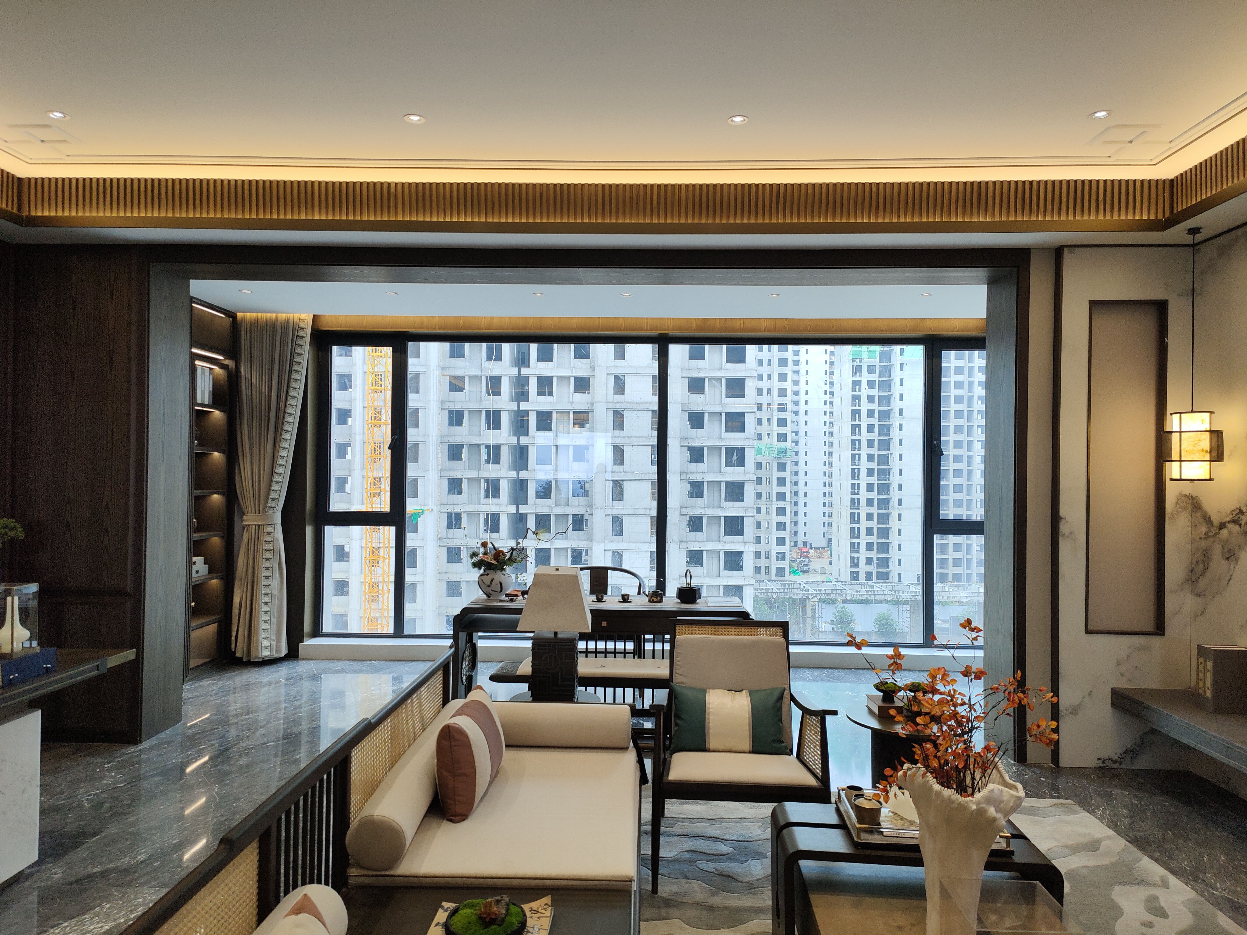 11號樓樣板間是229.33平米的五室三廳兩衛戶型,整體新中式的設計風格,屋內豪華家居搭配白、棕、灰三色調,奢華又不失典雅,點睛之筆的超大視野的落地觀景窗,讓房屋的高端時尚更加凸顯。整個樣板間無論門口的專屬私人電梯,還是屋內的天然石材地面、云中翡翠背景墻,都盡顯“大戶人家”的尊貴氣質。