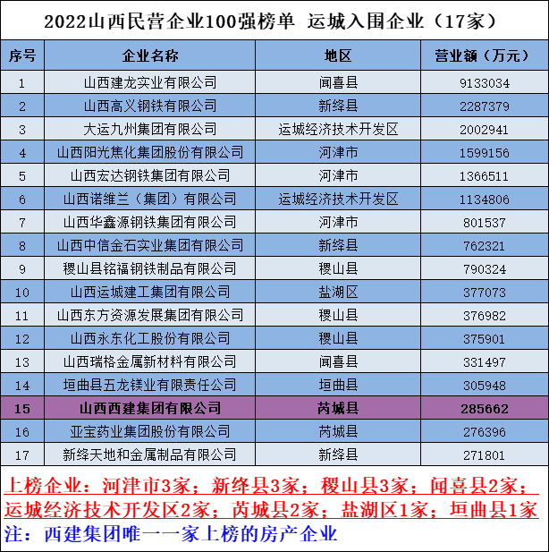 該榜單由山西省工商聯官方權威發布,以下為運城市上榜企業名單: