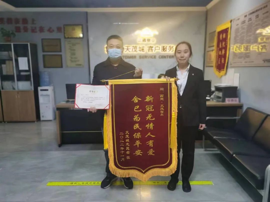 10月份疫情封控解除后,天茂城、天茂上郡、天茂和郡分別收到了業主們送來的錦旗,同時西建正通物業也為疫情期間積極奉獻的業主朋友送上最美志愿者證書及精美紀念品。下圖為業主們送來的部分錦旗。